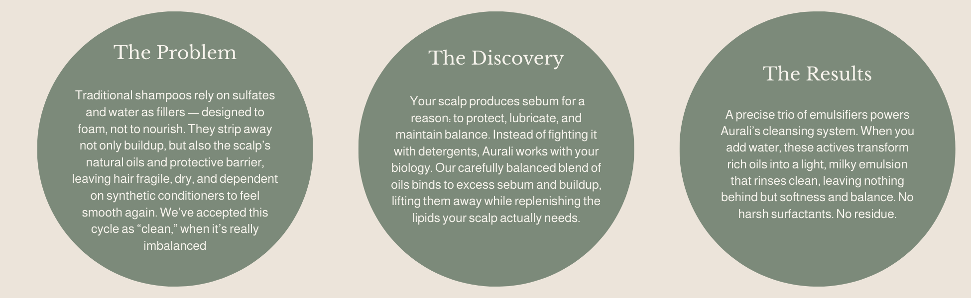 Where traditional shampoos rely on sulfates like SLS or SLES, water as filler, thickeners like salt, and layers of synthetic preservatives and synthetic fragrance, Aurali takes a different path β one that is powered by oils, actives, and naturally derived ingredients.